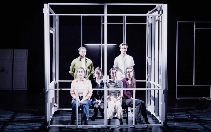 La perte la tourmente. Les Simone, des différents âges, parlent entre elles. Les personnages face public, se changent, changent de rôle et de ton. Le vertige commence à la prendre. Par sa petite voix intérieure, celle de ses âges perdus, elle est prise en étaux comme l’était, dans la scène initiale, la comédienne au crâne rasé par un rectangle de lumière qui la pressait dans l’espace. C’est la mort qui rôde. Celle d’une partie d’elle-même. La puberté la propulse dans une matérialité d’elle-même qui la sépare de sa famille. Tout bouge en Simone, comme les parois sur scène. Elle est « indécente » pour sa mère qui se méfie d’elle, laide des dires de son père, avec « un cerveau d’homme ». Elle est comme un monstre, prise au piège, oppressée. La musique compresse l’air autant que la pièce qui se resserre sur Simone. Il est question de la douleur de grandir, de cette violence de devoir exister pour soi.