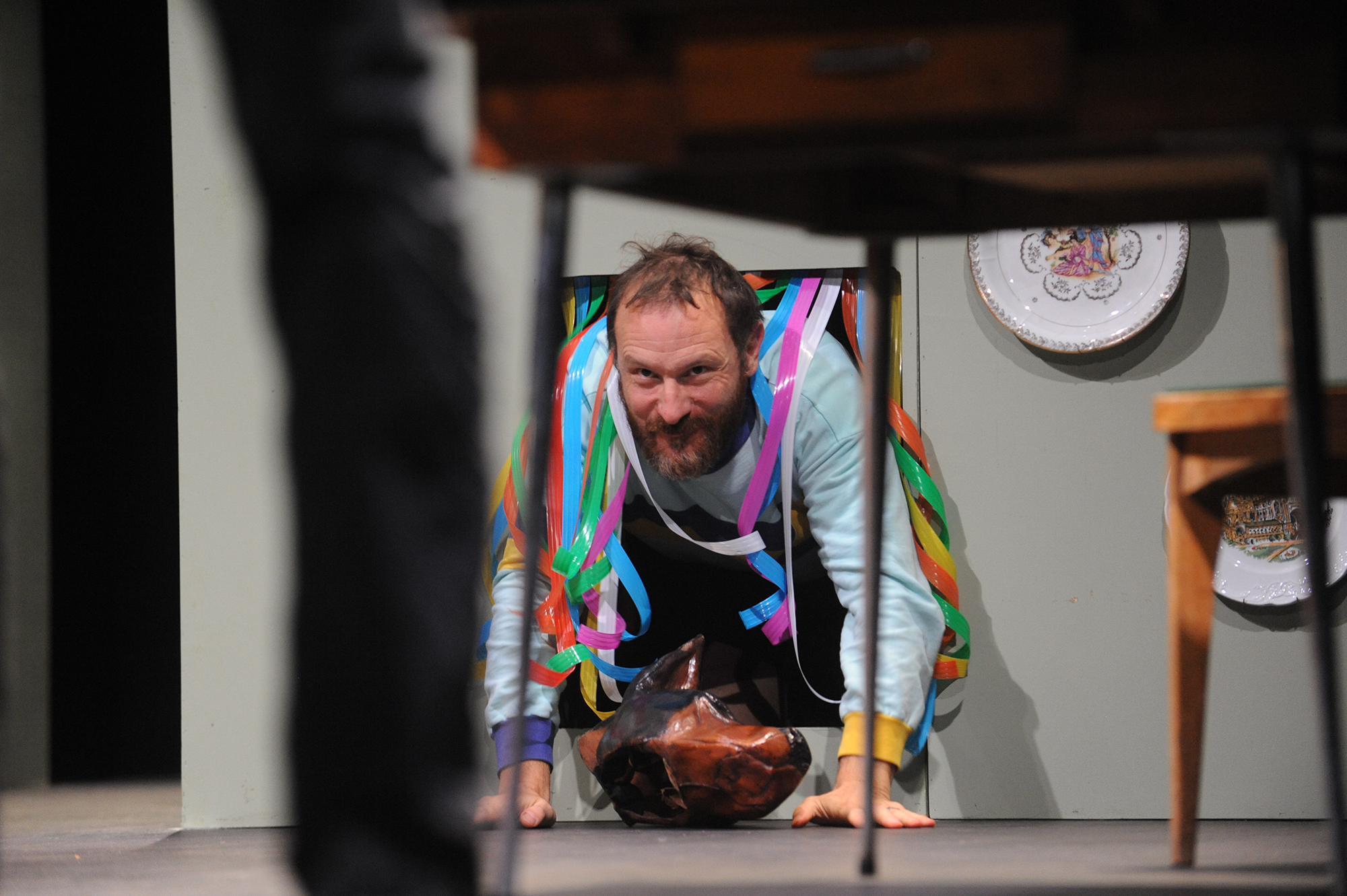 La force du spectacle vient du choix des femmes : une femme de ménage, une concierge. Choisir des femmes du peuple, c’est refuser un certain déterminisme social, c’est ramener le propos à l’universalité des sentiments. La relation qui lie la femme de ménage et la concierge relève de la sensualité, de l‘amour, de la reconnaissance de l’autre. Oui les femmes du peuple peuvent être amoureuses et peuvent avoir des histoires d’amour duelles. Par ce choix l’auteur et les interprètes nous ramènent à du commun non ordinaire mais simplement « simple ». Elles démontent de fait ce mythe de l’homosexualité féminine qui serait une fantaisie accordée aux bourgeoises et aux artistes. Casser les codes ne s’impose pas dans le récit comme une revendication. Le texte écrit par Marie Dilasser en collaboration avec les comédiennes – danseuses – metteurs en scène – scénographes évite cet écueil pour nous faire entrer radicalement dans une vérité du dehors – dedans qui définit l’espace de vie de ces deux femmes. La gaieté et la liberté de ton accompagnent la dissimulation, l’amour caché, la discrétion qui cadrent leur relation. Être deux en une, se fabriquer un costume pour vivre le quotidien. Sur le plateau, les deux femmes vivent leur vie sous nos yeux alors que le texte parle, évoque et nous guide dans cette relation belle de son audace. Cette histoire en forme de conte fait appel à « la voyante du 3ème étage » qui fait disparaître les gens qui pénètrent chez elles.
