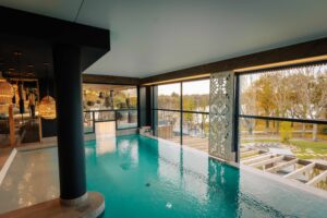 Retour à la lumière. Des cabanes en bois profondes et confortables font face à l’immense baie vitrée, inondée de soleil, avec vue sur le fameux Lac au Duc. Elles offrent une intimité rassurante, on s’y relaxe à l’abri du regard, seul ou à deux. Un bassin en inox, à débordement Hydroflow, offre une expérience de flottaison et de massage doux. La piscine chauffée, dotée d’un bassin de nage, invite à parcourir quelques longueurs. L’eau réconfortante, quelle que soit la saison, vous guide de l’intérieur vers l’extérieur, où des terrasses en bois et en plein air sont autant d’espaces de repos, suspendus entre terre et ciel.